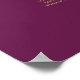Este gráfico de assentos contém atribuições de mesa para 170 convidados em 17 mesas, 10 convidados por mesa. O design é simples, mas elegante, com texto dourado sobre fundo magenta ou roxo do chassis e borras douradas de folha fina nos cantos. Uma maneira bonita de ajudar seus convidados a encontrar a mesa certa na sua recepção de casamento. O título diz "por favor encontre sua mesa" na caligrafia elegante do roteiro.