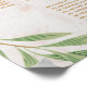 A tabela de assentos de casamento tem 18 mesas. Em todos os quatro cantos, há galhos salgueiros com folhas verdes. O fundo é mármore branco. Todo texto tem ouro colorido. A palavra Bem-vindo, acima, está escrita em uma caligrafia elegante, o resto em bonés. Os ramos salgueiros são do padrão de papel de parede "Willow Bough", criado por William Morris (1834-1896 ), agora no dominio público.