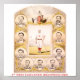 Impressão mostra retratos individuais de membros da equipe, cada um identificado pelo nome, em torno de uma imagem de um jogador uniforme inclinado sobre um morcego.
