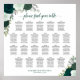 Adicione charme e sofisticação à sua recepção de casamento com este lindo quadro de assentos de casamento, adornada com um design floral de cor aquática rústica. Com assentos para até 220 convidados, cada mesa acomodando 10 assentos, este quadro apresenta uma mistura rústica de rosas e flores em tons de verde esmeralda e sábio, graciosamente entrelaçados com grampos de folhas de eucalipto e verde de jardim. O elegante título de caligrafia de escrita adiciona um toque de glamour, criando uma atmosfera sofisticada para o seu dia especial, e há espaço para os nomes de casais e a data do casamento no fundo.