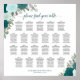 Adicione charme e sofisticação à sua recepção de casamento com este lindo quadro de assentos de casamento, adornada com um design floral de cor aquática rústica. Com assentos para até 220 hóspedes, cada mesa acomodando 10 assentos, este quadro apresenta uma mistura rústica de rosas e flores em tons de chato, turquesa, aqua e ciano, graciosamente entrelaçados com grampos de folhas de eucalipto e verde de jardim. O elegante título de caligrafia de escrita adiciona um toque de glamour, criando uma atmosfera sofisticada para o seu dia especial, e há espaço para os nomes de casais e a data do casamento no fundo.