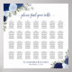Este elegante quadro de assentos de 28 mesas apresenta um design floral de cor d'água, pintado à mão, que exude elegância e charme, com rosas deliciosos em tons de azul empoeirado, marinho e índigo, este quadro de assentos é uma verdadeira obra de arte. Espelhados por todo o design são galhos encantadores de folhas de eucalipto e de verde-jardim, o título da caligrafia elegante acrescenta um toque de sofisticação refinada. Com assentos para 280 convidados e 10 lugares por mesa, este quadro é prático e visualmente atraente, fazer sem esforço para seus convidados encontrarem seus assentos. Transforme sua recepção de casamento em uma terra maravilhosa encantadora com este assento gráfico impressionante que captura a essência do romance rústico e do estilo do eterno.