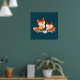 Um poster com desenho de 2 raposas vermelhas. Um de pé no outro deitado. Desenhado com aquarela.