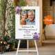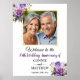 Este sinal de boas-vindas do Aniversário do Casamento tem uma elegante caligrafia de script, uma estrutura dourada com 1 foto especial e rosas roxos. Você pode personalizar este sinal com seus detalhes de aniversário de casamento.