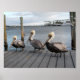 Uma foto de três pelicanos seguidos em uma doca de barco na praia do Panamá, na Flórida.