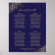 Este lindo gráfico de assentos de casamento de 4 mesas inclui atribuições de mesa para 40 convidados, com 10 pessoas em cada mesa. O design é simples, mas elegante, com texto dourado sobre fundo azul marinho e apresenta um arquivo floral herdado nos cantos e um título da caligrafia do rico, que lê "por favor encontre sua mesa". Sofisticado e chique.