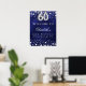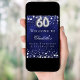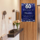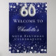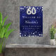 Um poster de boas-vindas para uma 60ª festa de aniversário. Um fundo azul marinho com estrelas elegantes e falsas prateadas. A cor azul é irregular. Personalize e adicione um nome e texto. Cartas brancas.