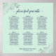 Este gráfico de 6 mesas é simples e elegante, com texto azul marinho sobre fundo verde-claro ou nu colorido e filigre floral de cinzas prateadas herdadas nos cantos. O título diz "por favor encontre sua mesa" em uma caligrafia elegante. Sofisticado e chique. Inclui atribuições de mesa para 60 convidados com 10 lugares por mesa.