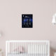 Um design de casamento para um tema de casamento celestial, com a lua e estrela em um fundo azul de noite estrelada. A palavra Bem-vindo e os nomes são escritos em uma fonte caligráfica elegante. A lua e a palavra Casamento são cinza prateado, o resto do texto é branco.