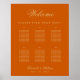 Um simples gráfico de assentos com 6 mesas, para um casamento com cor de casamento laranja queimada. O fundo é laranja queimado, o texto é amarelo ouro. A palavra Bem-vindo na parte superior e os nomes são escritos em um roteiro caligráfico elegante, o resto em bonés.