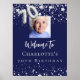Uma poster de boas-vindas para uma festa de aniversário feminina e glamourosa. Um fundo azul marinho decorado com estrelas. Personalize e adicione uma foto e um nome. O número 70 é escrito com uma fonte no estilo do balão em falso prata.