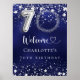Um poster de boas-vindas para uma festa de aniversário 70. Um fundo azul marinho com estrelas elegantes e falsas prateadas. A cor azul é irregular. Personalize e adicione uma foto, nome e texto. Cartas brancas.