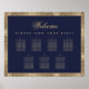 Um gráfico de assentos vintage e elegante com 7 mesas, recomendado para um casamento com cores de casamento azul-marinho e dourado. O fundo é azul-marinho. Possui bordas douradas florais com decorações intricadas de rosas silvestres. Todo o texto é dourado. A palavra Bem-vindo na parte superior é escrita em uma fonte caligráfica elegante, o restante em maiúsculas.