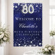 Um poster de boas-vindas para uma festa de aniversário 80. Um fundo azul marinho com estrelas elegantes e falsas prateadas. A cor azul é irregular. Personalize e adicione um nome e texto. Cartas brancas.