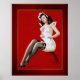 O Maid do pintor americano Peter Driben (1903 - 1968); pintor, ilustrador e um dos mais prolíficos artistas de pin-up dos anos 1940 e 1950. Uma ilustração atraente e sensual de uma beleza cabeleira feita em um uniforme de empregadas mais revelador. Ela tem ao redor do cabelo uma fita rosa larga que gravatas por um arranjo floral no topo da cabeça. O uniforme das empregadas brancas tem um profundo corte de v no centro e é sem dormir, com apenas alguns de cima devem brilhar com sotaques vermelhos rufados nele. Ao longo dos lados perto de seus quadris estão três ovais de corte que se tornam progressivamente grandes de cima a baixo e os bolsos do uniforme em que ela tem as mãos atadas têm aparas vermelhas rochedas ao longo da borda superior. Ela está sentada na borda de um feixe de madeira curvo, ao revelar suas belas pernas que se cobriam em meias escuras bem acima de sua coxa, com uma banda laranja na coxa esquerda; além de vestir calçados de salto alto de corda abertos em preto. O fundo da imagem é um abstrato vermelho leve com traços laranja finos em volta do corpo.