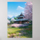 Uma tradicional casa de madeira japonesa se coloca em meio a um mar de relva verde esmagadora, cercada por delicados arbustos cor-de-rosa e lindas árvores cerejeiras floridas em cheio. Este trabalho de arte digital captura a essência pacífica e calorosa de uma casa tradicional japonesa, aninhada no meio da beleza natural de seu entorno.
