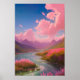 Um rio correndo por um vale pitoresco, cercado por uma relva verde-luxuosa, colinas rolantes e delicadas flores cor-de-rosa. O céu acima está inundado em tons de rosa e azul, lançando um brilho sereno sobre a cena de tirar o fôlego. Este trabalho de arte digital captura a beleza dinâmica da natureza, uma adição vibrante e tranquila a qualquer espaço.