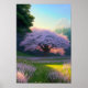 Uma árvore de cerejeira atordoante, alta no meio de um campo de grama verde misturada com delicadas flores cor-de-rosa. Suas flores são como nuvens cor-de-rosa delicadas, somando à beleza natural dessa paisagem serena e pacífica.