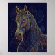 This image features a majestic horse rendered in delicate yellow, blue, and orange lines against a deep navy background. Abstract fractal and wave patterns create an ethereal beauty.