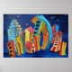 Uma imagem divertida e contemporânea de prédios coloridos flutuando na água.