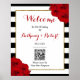 A coleção de casamento moderno e luxuoso apresenta um clássico fundo listrado em preto e branco acentuado com belas rosas vermelhas rubi e uma moldura com folha de ouro falso. Este sinal de boas-vindas é fácil de personalizar e será a sinalização perfeita para qualquer casamento, chá de noiva, festa de aniversário, celebração de noivado ou qualquer outra ocasião especial. O texto do modelo e o código QR são fáceis de personalizar para tornar este sinal único para o seu evento especial.