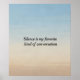 Esta é uma imagem tipográfica simples e elegante com a citação introspectiva, "O silêncio é o meu tipo favorito de conversa." O texto é apresentado numa fonte serif clássica e refinada, centrada num fundo suave, de cinza clara. O design minimalista enfatiza a mensagem, fazer-a ideal para postas sobre introversão, tranquilidade, reflexão e busca paz em momentos tranquilos. Fala para aqueles que valorizam mais ouvir do que falar e encontram conforto na solidão.