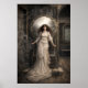 Esta é uma imagem original de arte fantástica derivada de um desenho antiquado da era vitoriana em caneta e tinta preta e branca da Dama de Shalott medieval arthuriana.