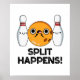 O Split Happens Funny Boliche Pun apresenta uma bola de boliche engraçada entre dois pinos de boliche. Presente perfeito para a família e amigos que adoram trocadilhos de boliches esportivas bonitinhas.