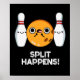 O Split Happens Funny Boliche Pun apresenta uma bola de boliche engraçada entre dois pinos de boliche. Presente perfeito para a família e amigos que adoram trocadilhos de boliches esportivas bonitinhas.