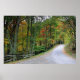 Fotografia de uma pequena estrada nacional forrada em árvore no outono.