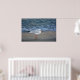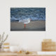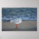 Uma gaivota de lago enfrenta uma onda à praia de areia a Mar Báltico costa