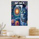 Um gato majestoso adorado com joias que olham com inteligência sob um vibrante e estrelado céu noturno. Cercado por intrincados padrões, flores coloridas e um sol ornamentado, a cena explode com charme místico e brilhantismo artístico. Gato Whimsical Olhando debaixo de um céu estrelado à meia-noite. A hora da soneca é a qualquer momento.