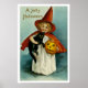 Vintage vitoriana Vintage Halloween ilustrando uma garota segurando um Jack-o-Lanterna e um gato preto.