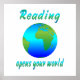 Compartilhe o quão importante é a leitura para as nossas vidas com esta design bonito com o globo e as palavras - A leitura abre o seu mundo. Excelente para professor ou bibliotecário.