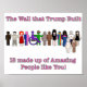 O texto cor-de-rosa diz: A Parede que Trump Construiu é feita de Pessoas incríveis como você! Há vários designs de caráter humano em uma linha. Um pino de segurança e alguns flocos de neve também são incorporados ao design.