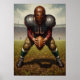 Uma poderosa pintura a óleo de Art Deco que retrata um monumental quarterback feminino em uma armadura de couro cabeludo, sua forma geométrica estilizada definida pela iluminação moody chiaroscuro enquanto se prepara para jogar a bola.