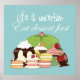 Engraçado com sobremesa e pastos e o conselho do excelente "A vida é incerta, coma sobremesa primeiro". Três macarões, um cupcake, um sorvete, um morango coberto de chocolate, um brownie com uma colher de sorvete de baunilha e molho de creme e chocolate, uma massa de merengue e um bolo de princesa coberto de maçapão com rosa de maçapão.