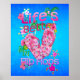 Muito colorida e design tropical comemorando Chinelos vestidos, vida em ilhas e tempos na praia. Chinelos com padrão havaiano de Máscaras de Tiki e tartarugas marinhas, com palmeiras, flores de hibisco e tartarugas de mel. Com um fundo azul-oceano.