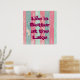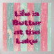 A vida é melhor no lago, escrita em uma fonte grande e ousada. O fundo é uma textura rústica, áspera e meteorológica de cerca de madeira em listras cor-de-rosa e verdes.