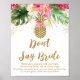 Este adorável Jogo Não Diga Noiva é uma maneira divertida e interativa de iniciar a diversão no seu Chá de Noiva e garantido que será um enorme sucesso! Basta exibir este lindo cartão perto da entrada do chá de bebê junto com uma cesta de anéis. Cada convidada usará um anel. Quando ouvirem outra convidada dizer "Noiva", elas podem pegar o anel dela! Quem tiver mais anéis ao final do chá vence! O design apresenta flores tropicais em aquarela de verão com confetes dourados e um abacaxi dourado. O texto rosa e dourado combina com o adorável design floral.