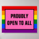 "Profundamente Aberto a Todos" lê a mensagem Abrir a Todos (#OpenToAll) que sua empresa ou casa pode mostrar para mostrar que a homofobia e a intolerância não têm lugar em sua vida ou em sua empresa. Também disponível como poster se quiser ter certeza de que todos os seus clientes, vizinhos e comunidade sabem que a comunidade LGBTQ é bem-vinda. Mostre seu apoio à comunidade LGBTQ o ano todo, não apenas durante o Orgulho.