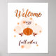 Poster de "boas-vindas ao outono" com uma abóbora laranja, folhas de outono e vagalumes. Adicione o nome ou o elemento a ser concluído e faça o check-out da coleção para obter mais informações sobre a decoração de outono.
