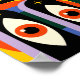 Esta ilustração vibrante e intrincada é uma composição abstrato simétrica que apresenta um conjunto ousado de formas e cores geométricas. A imagem é dividida em quatro quadrantes principais, cada um com seus próprios elementos distintos que formam coletivamente um design coeso e surreal. Os motivos dominantes incluem olhos grandes estilizados com irrisões vermelhos e reflexões semelhantes às estrelas, assim como formas circulares e angulares em uma paleta impressionante de amarelo, vermelho, azul, verde, rosa e esbranquiçado. A estética geral lembra a arte psicodélica, a arte pop, e influências cubistas, criando uma peça visualmente dinâmica e cativante.