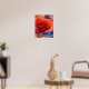 O poster floral artístico e moderno apresenta AI gerada abstrato digital vermelho marmoreado e rosa cor de laranja sobre fundo azul.