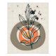 Uma ilustração impressionante apresenta uma folha contra um pano de fundo de formas circulares vibrantes em tons de laranja e cinza, incorporando um estilo artístico moderno.