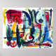 As verticais pretas se intersetam entre as outras formas de cores para criar movimento como uma página de partituras em ação. Criado em acrílico.