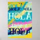 Texto Hola repetido numa paleta colorida de azul, amarelo, rosa, turquesa e verde.