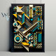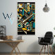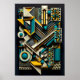 Uma abstrato de arte colorida sobre o fundo, no estilo de formas geométricas de arte deco, detalhes hiperrealistas, ciano escuro e ouro, objetos desconstruídos, padrões ousados e tipografia, isométrica, cenas detalhadas de multidão