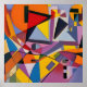 Esse é um clássico abstrato geométrico ao estilo da escola abstrato-expressionista, com círculos e ângulos. A cor laranja dominante é combinada com amarelo, tons de azul, roxo, rosa e preto. Foi imaginado com IA.