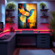 Um beija-flor colorido voa em formas geométricas e abstrato. Azuis vívidos, dourados e laranjas se misturam em um design moderno que celebra a natureza com uma reviravolta criativa. Perfeito para amantes de animais abstrato, arte moderna de parede e decor contemporâneo.